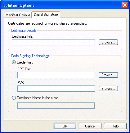 | Credentials | Select this option to use credential files as the code signing technology. If you select this option, you must supply the name and location of both your software publishing credential files: SPC File and PVK File. In order to receive a software publishing credentials and a private key, you must supply a certification authority, such as VeriSign, with specific information about your company and software. |