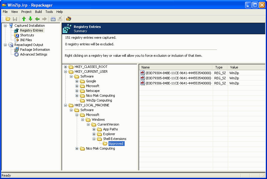 The upper pane displays the number of registry entries captured and how many of these entries will be excluded from the Windows Installer package when built. The lower-left pane provides a tree displaying the registry keys and subkeys captured. When you select a key from the tree, the lower-right pane displays any registry values for that key. Displayed information includes: