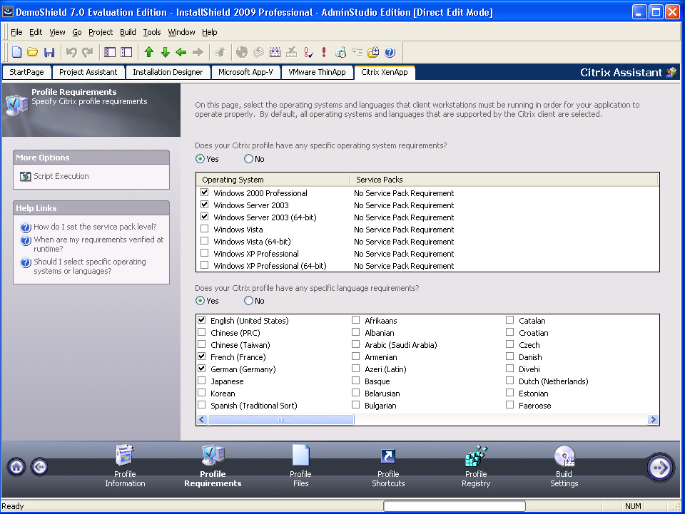 On the Profile Requirements page of the Citrix Assistant, you can select the operating systems that client workstations must be running in order for your application to operate properly. By default, all operating systems that are supported by the Citrix client are selected.