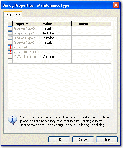 You cannot hide UI sequence dialogs until you provide values for all currently null properties. These values are necessary to establish a new dialog box display sequence. Each property which must be configured prior to hiding the dialog in the sequence is marked with . Either configure the null properties, or click Cancel to return to the Dialogs view. Typically, configuring a null property involves clicking in the property’s value field and selecting the value from the drop-down list.