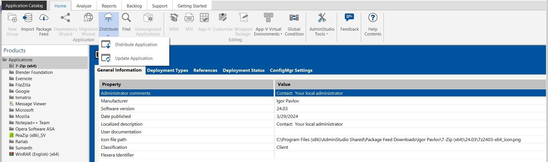 - In the Application Catalog tree, select the application or group of applications that you want to update and click the Distribute > Update Application in the ribbon. Alternatively, right-click on an application and select Update Application from the from the context menu.
