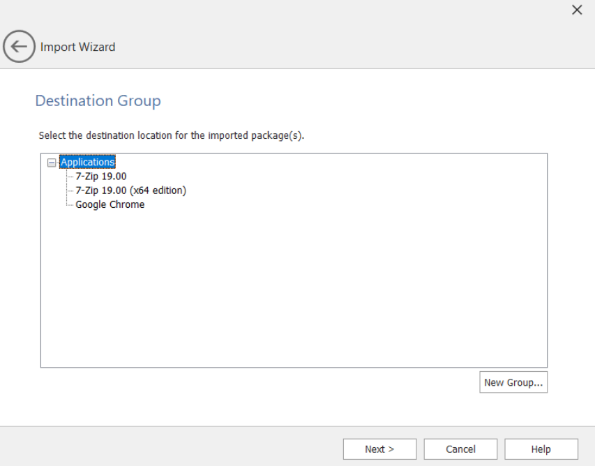 14. Select a destination group into which your package will be imported.