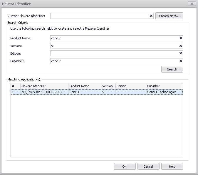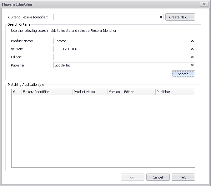 - Matching application not found—If a matching application is not listed, continue with the steps in Creating Local Flexera Identifier Entries for Internal or Repackaged Applications to create a new local Flexera Identifier.