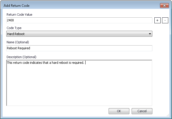 Return Code ValueEnter a unique value. The following return codes are populated by default during import: 0 —Success (no reboot) 1707 —Success (no reboot) 3010 —Soft Reboot 1641 —Hard Reboot 1618 —Fast Retry When you are editing an existing return code, this field cannot be edited.