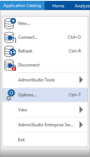 - On the Application Catalog tab menu, select Options . The Options dialog box opens.