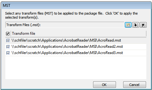 .mst) files that you want to import along with the Windows Installer package. If you do not want to import a selected.mstfile, clear the selection. -