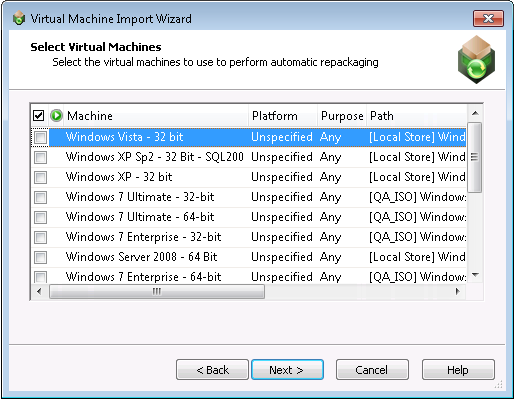 | Purpose | By default, virtual machines that you add to the Packages tab will be available for use for both automated repackaging of packages and for testing packages. However, if you want to specify that a virtual machine should be used for only repackaging or for only testing, click in the Purpose column of that virtual machine and select one of the following options: Repackaging— Virtual machine will only be used to perform automated repackaging. Testing— Virtual machine will only be used to test packages. You test a package by right-clicking on it on the Packages tab and selecting Launch Package for Testing from the shortcut menu. You will then be prompted to install and run that package on a virtual machine. Any— Make this virtual machine available for use during both automated repackaging and package testing. This is the default value. If the Purpose column is not listed in the Machines list, you can select it in the Columns area and drag it to the list, or you can edit the Purpose value in the Properties window. The Launch Package for Testing functionality will primarily be useful to test converted packages. However, if a problem occurs during conversion, it is also possible to use this function to install and launch the source package for testing. |
