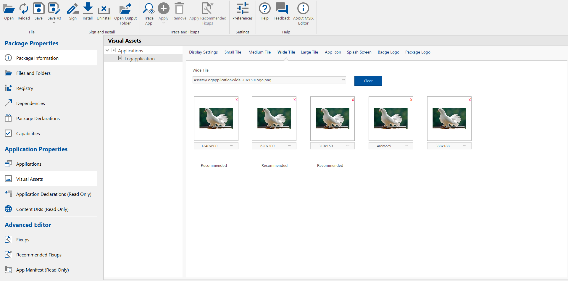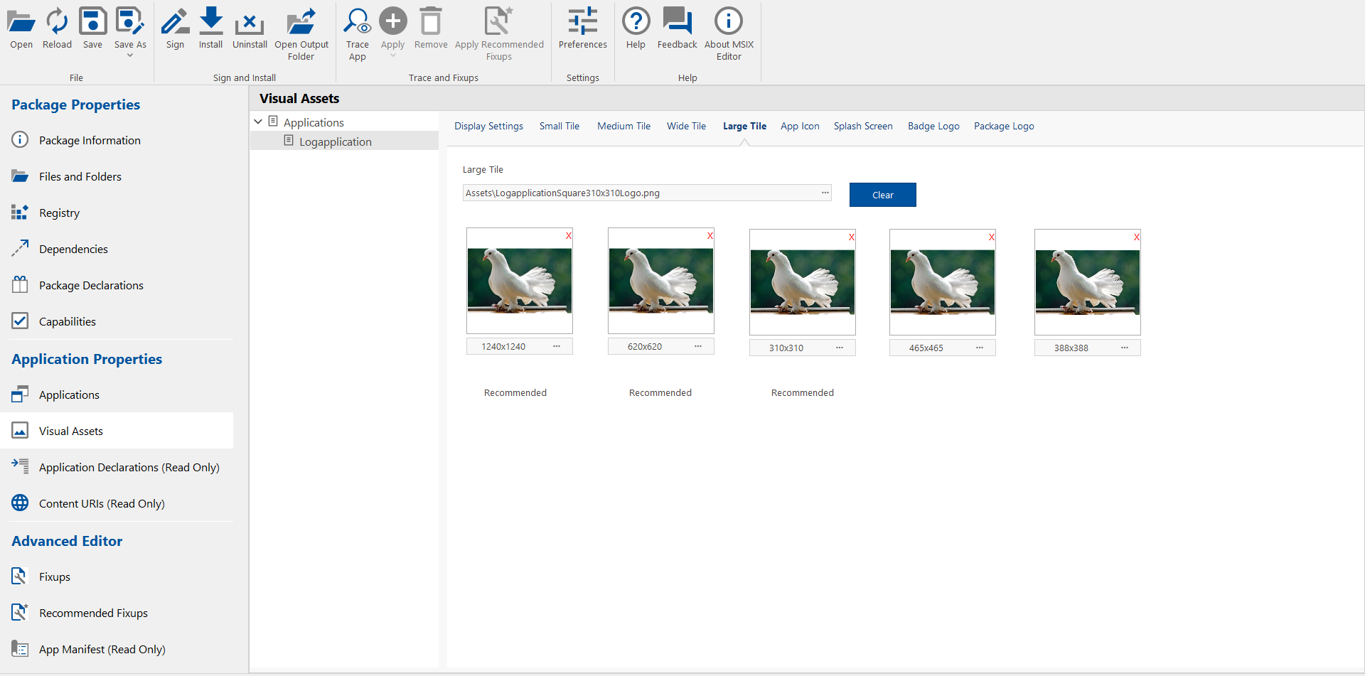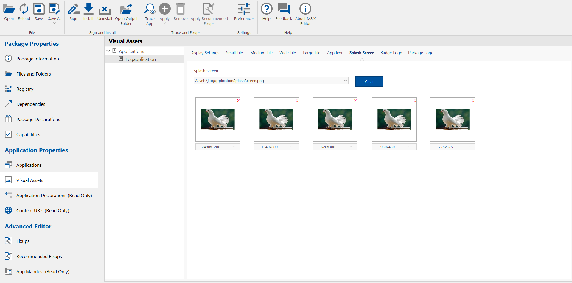 Visual Assets comprise of different tile sizes, application icon, package logo, splash screen and badge logo. Upon its installation, MISX surfaces on a Windows machine through these visual assets, for example as tiles and/or application icon on the start menu. Unlike traditional MSI icons, Visual Assets provide flexibility to specify different sizes of tiles and icons with different images and scales. The Visual Assets view enables you to view, edit and generate new visual assets for an MSIX package.