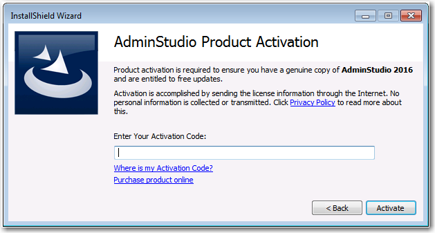 2. Select Activate or Purchase AdminStudio and click Next . The AdminStudio Product Activation dialog box opens, and you are prompted to Enter Your Activation Code .