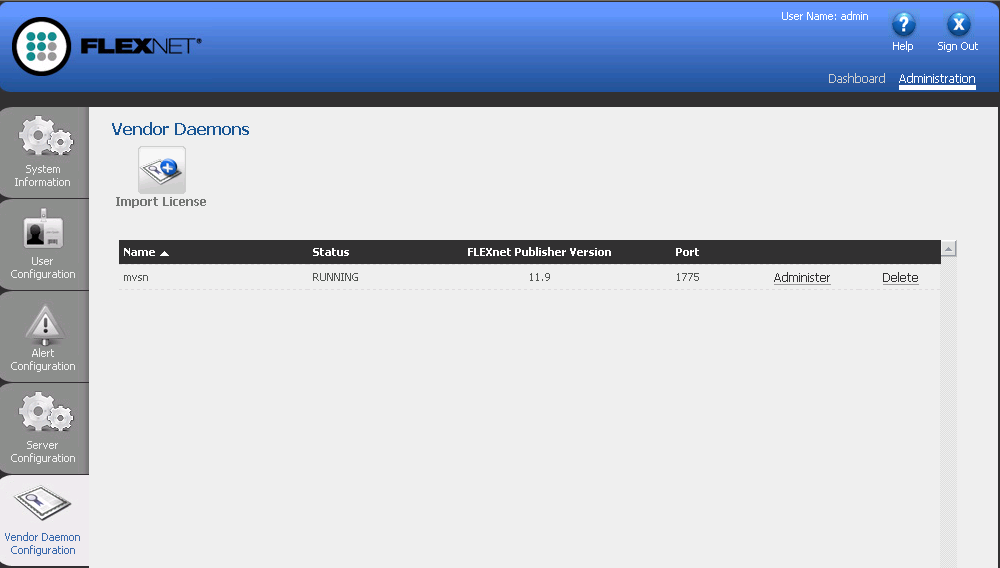 - Click the Administration link, and then click the Vendor Daemon Configuration tab.